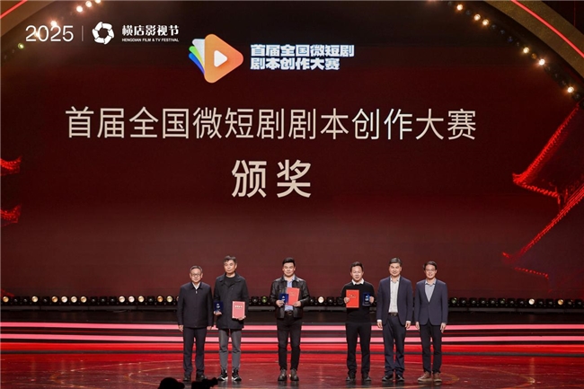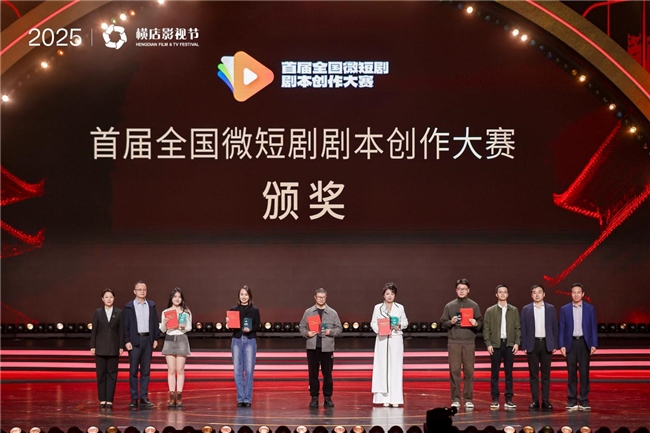 在备受瞩目的“2025横店微短剧之夜”上,《烟火可亲》《婺婺剧女王:我的剧团不倒闭》等获得一、二、三等奖的10部优秀剧本的编剧代表依次上台,中国网络视听协会副会长陶嘉庆、浙江省文广旅厅副厅长吕伟刚、金华市副市长庄凌飞等主办机构代表,为获奖编剧颁发了奖杯与证书。