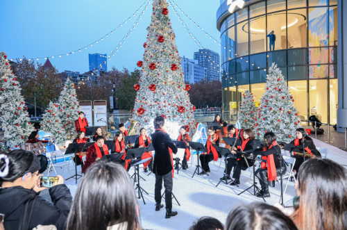 12月20日晚间,一场浪漫的冬日亮灯仪式完美呈现。随着倒数声响起,现场观众见证了这一高光时刻——艺术装置被点亮的一瞬间,漫天“飞雪”翩然而下,乐队演奏悄然加入,与璀璨的树灯、浪漫的飘雪共同构筑了一个视听交融的梦幻场景,营造出极具仪式感的节日氛围。东方交响管乐团的演出也为这次盛会欢注入了高雅的文化质感,满足消费者对审美与格调的追求,实现商业与艺术的巧妙融合。